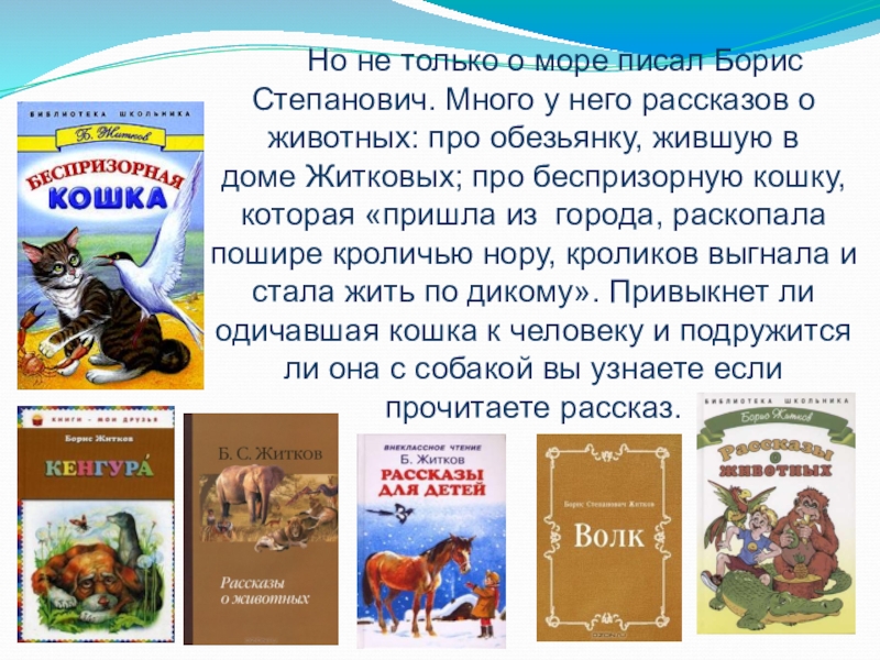 Слайд 13Но не только о море писал Борис Степанович. Много у него рассказов о животных: про обезьянку,
