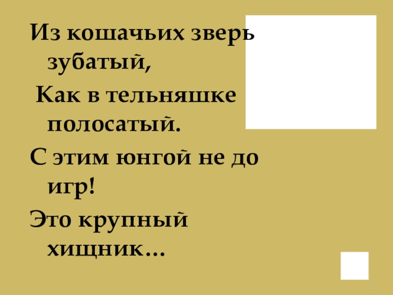 Из кошачьих зверь зубатый, Как в тельняшке полосатый.С этим юнгой не до игр!Это крупный хищник…