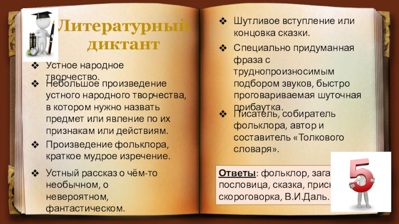 Ответы: фольклор, загадка, пословица, сказка, присказка, скороговорка, В.И.Даль.