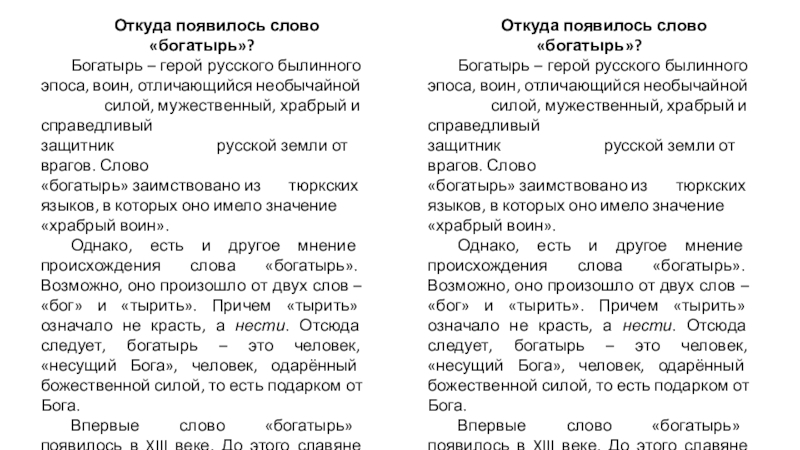 Однако, есть и другое мнение происхождения слова «богатырь». Возможно, оно произошло от двух слов – «бог» и «тырить». Причем «тырить» означало не красть, а нести. Отсюда следует, богатырь – это человек, «несущий Бога», человек, одарённый божественной силой, то есть подарком от Бога.
