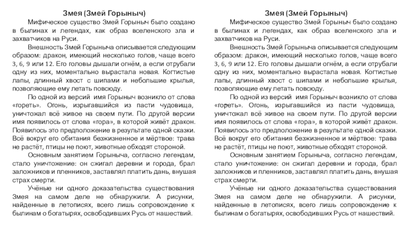 Мифическое существо Змей Горыныч было создано в былинах и легендах, как образ вселенского зла и захватчиков на Руси.