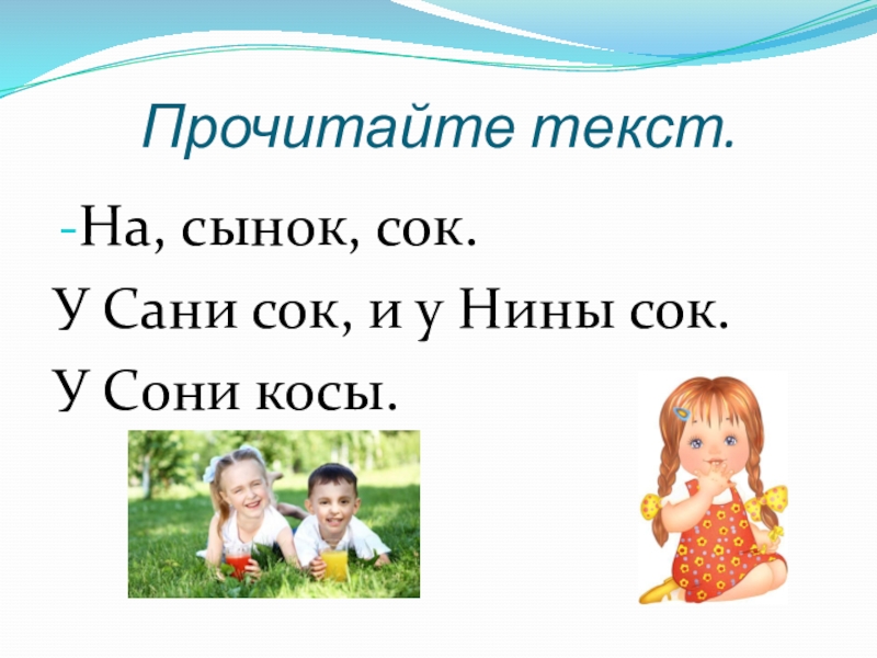 Прочитайте текст.На, сынок, сок.У Сани сок, и у Нины сок.У Сони косы.