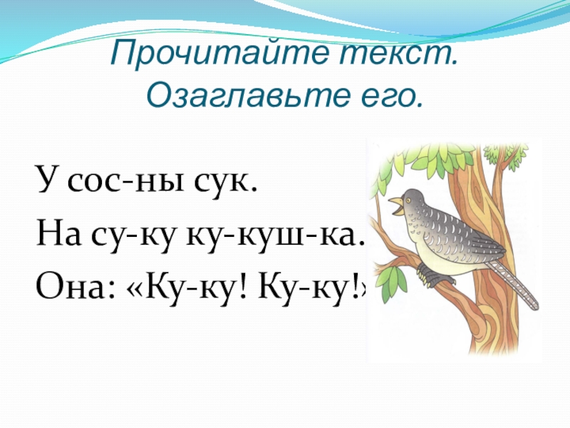 Прочитайте текст.  Озаглавьте его. У сос-ны сук.На су-ку ку-куш-ка.Она: «Ку-ку! Ку-ку!»