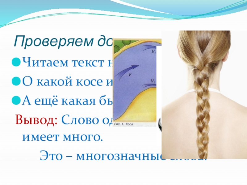 Проверяем домашнее заданиеЧитаем текст на с.49О какой косе идёт речь?А ещё какая бывает коса?Вывод: Слово одно, а
