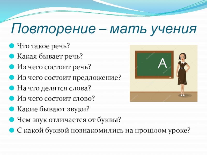 Повторение – мать ученияЧто такое речь?Какая бывает речь?Из чего состоит речь?Из чего состоит предложение?На что делятся слова?Из