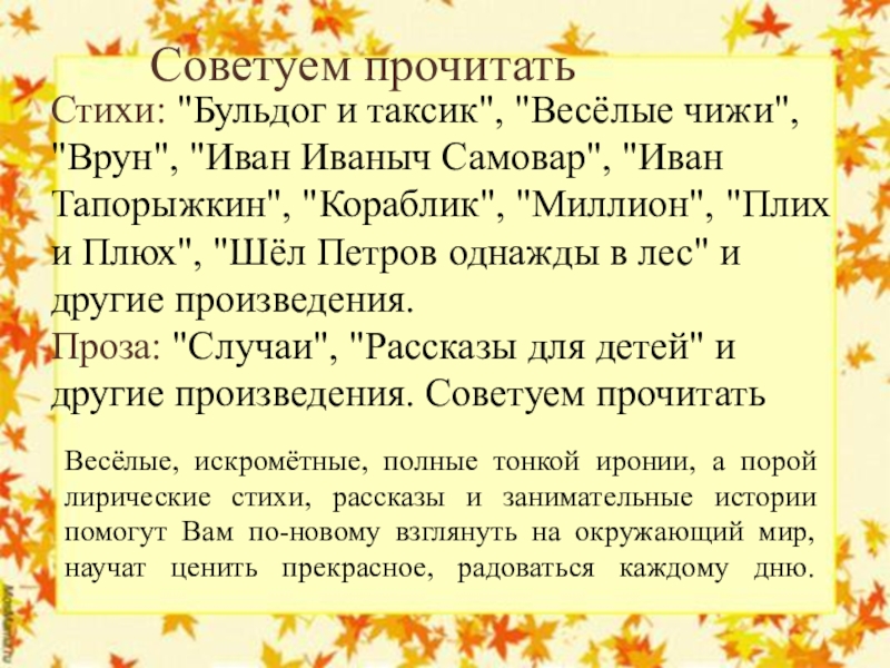 Весёлые, искромётные, полные тонкой иронии, а порой лирические стихи, рассказы и занимательные истории помогут Вам по-новому взглянуть на окружающий мир, научат ценить прекрасное, радоваться каждому дню.