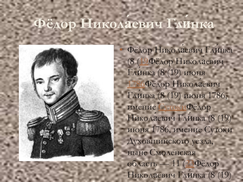 Фёдор Никола́евич Гли́нкаФёдор Никола́евич Гли́нка (8 (19Фёдор Никола́евич Гли́нка (8 (19) июня 1786Фёдор Никола́евич Гли́нка (8 (19) июня 1786, имение СутокиФёдор Никола́евич Гли́нка (8 (19) июня 1786, имение Сутоки Духовщинского уезда, ныне Смоленская область — 11 (23Фёдор