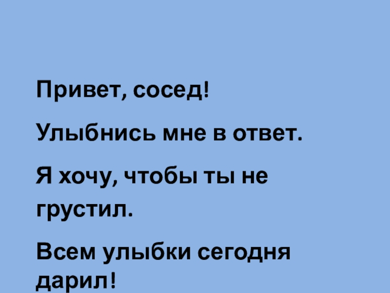 Привет, сосед!Улыбнись мне в ответ.Я хочу, чтобы ты не грустил.Всем улыбки сегодня дарил!