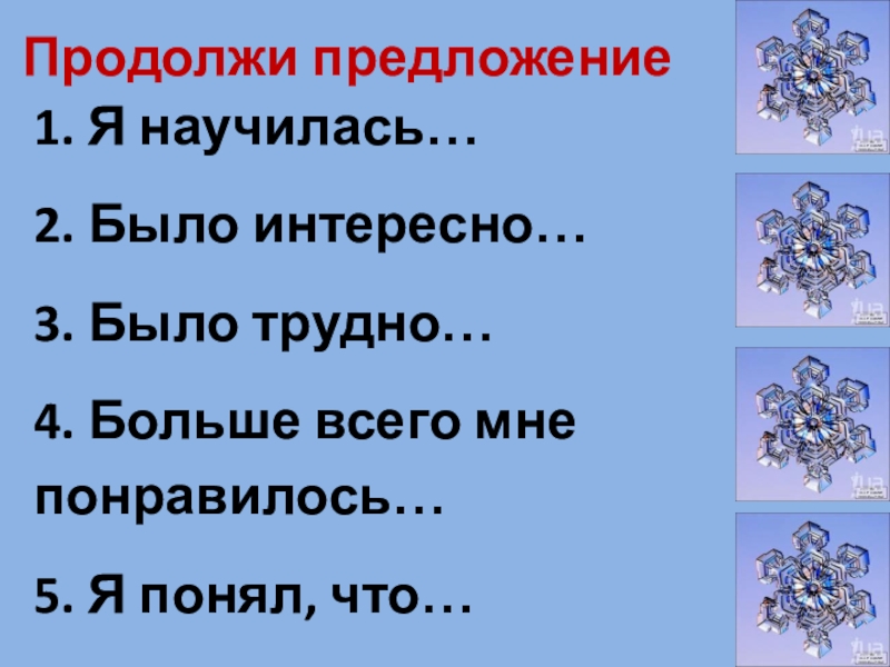 Продолжи предложение1. Я научилась…2. Было интересно…3. Было трудно…4. Больше всего мне понравилось…5. Я понял, что…