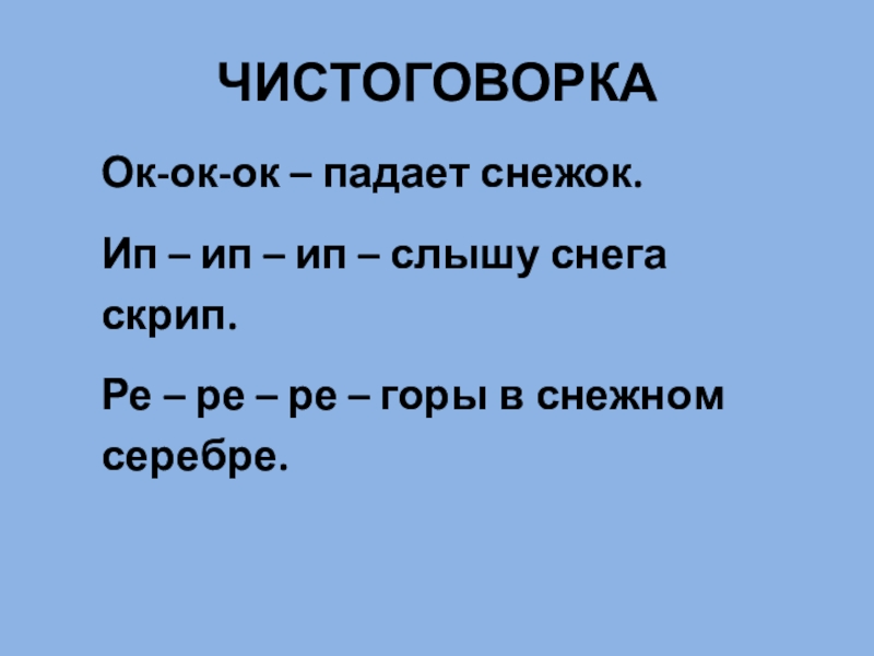 ЧИСТОГОВОРКАОк-ок-ок – падает снежок.Ип – ип – ип – слышу снега скрип.Ре – ре – ре –