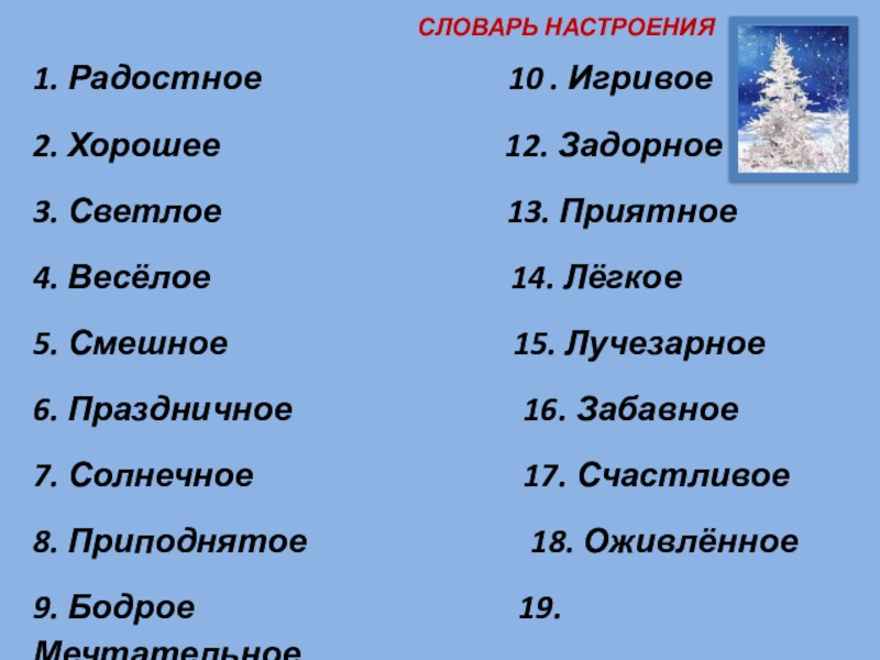 СЛОВАРЬ НАСТРОЕНИЯ 1. Радостное