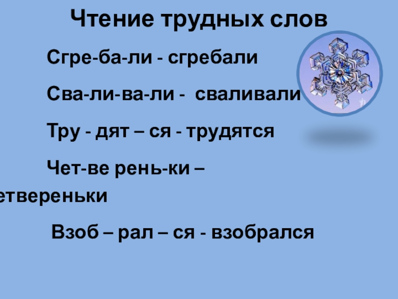 Чтение трудных слов         Сгре-ба-ли - сгребали