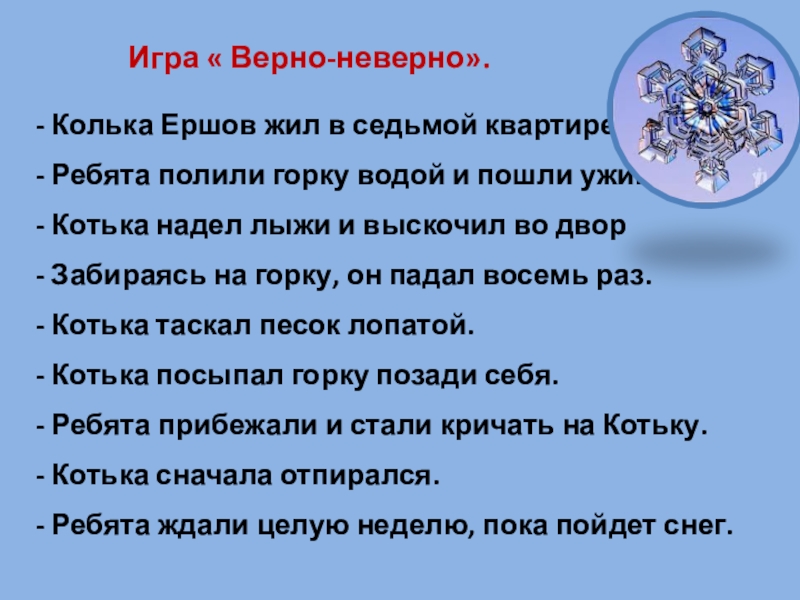 Игра « Верно-неверно». - Колька Ершов жил в седьмой квартире.- Ребята полили горку водой и пошли