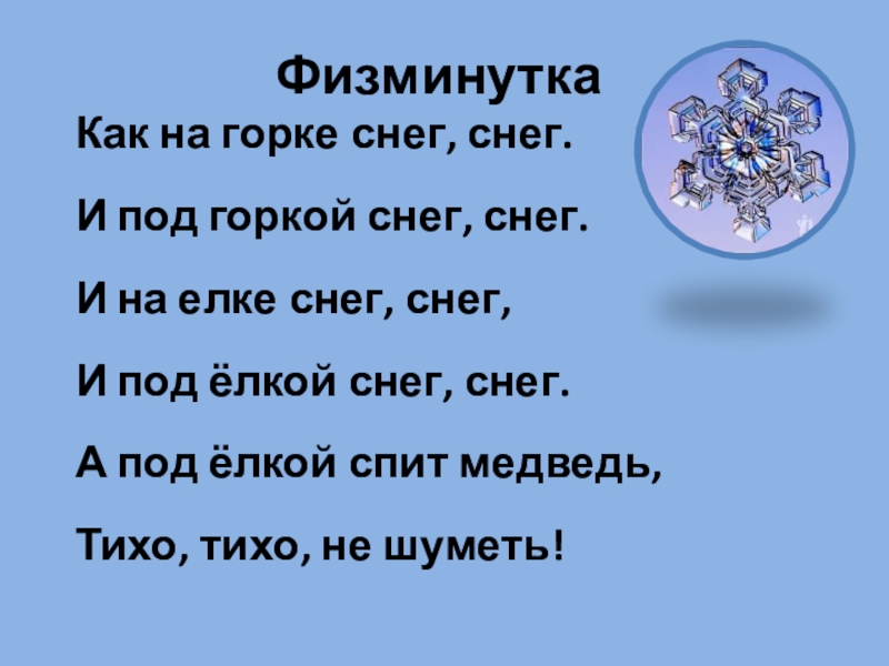 ФизминуткаКак на горке снег, снег.И под горкой снег, снег.И на елке снег, снег,И под ёлкой снег, снег.А