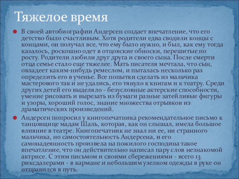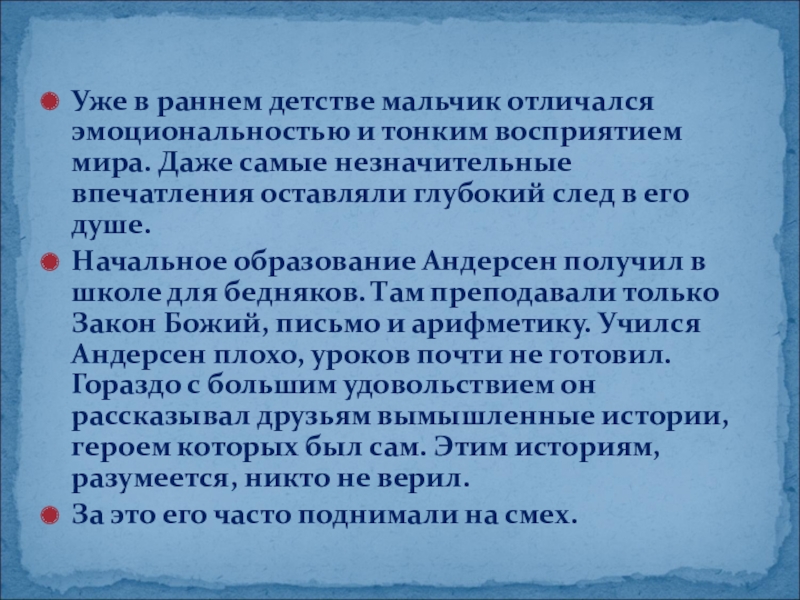 В своей автобиографии Андерсен создает впечатление, что его детство было