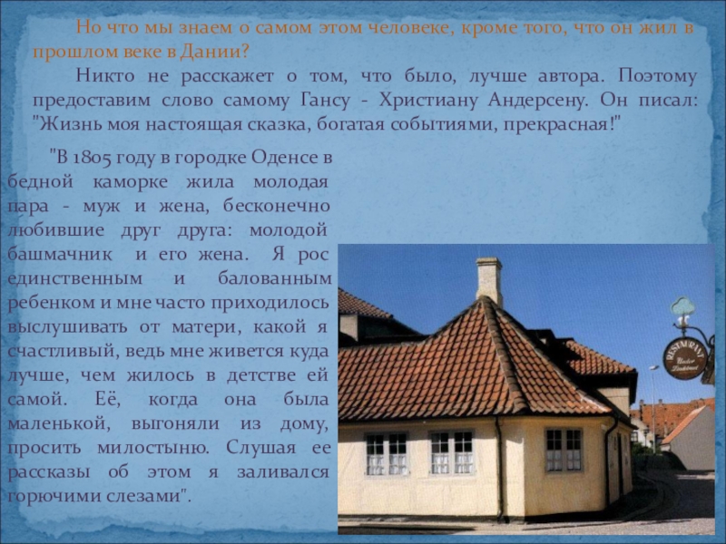 "В 1805 году в городке Оденсе в бедной каморке жила молодая пара - муж и жена, бесконечно любившие друг друга: молодой башмачник и его жена. Я рос единственным и балованным ребенком и мне часто приходилось выслушивать от матери, какой я счастливый, ведь мне живется куда лучше, чем жилось в детстве ей самой. Её, когда она была маленькой, выгоняли из дому, просить милостыню. Слушая ее рассказы об этом я заливался горючими слезами".