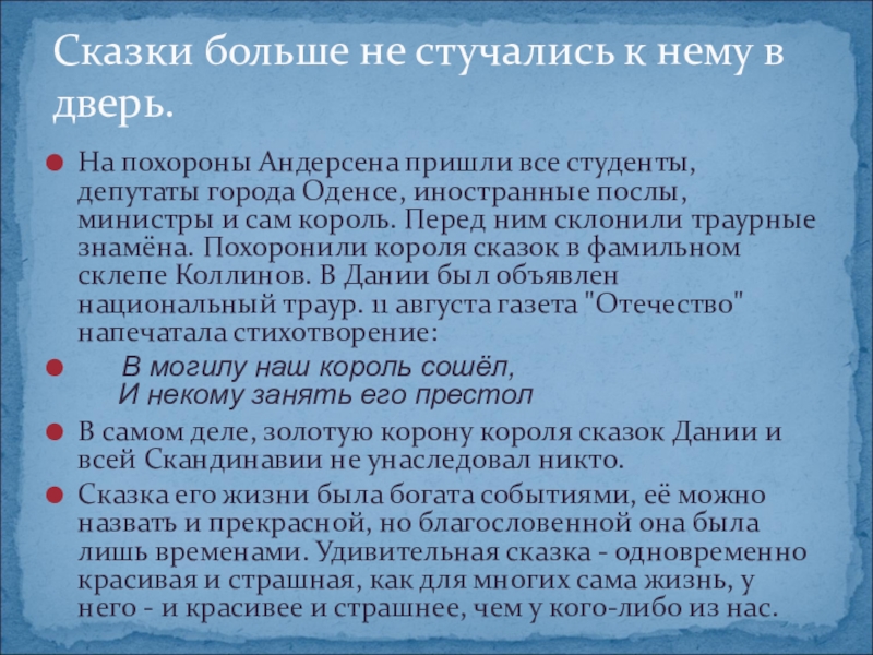 Слайд 18Сказки больше не стучались к нему в дверь.