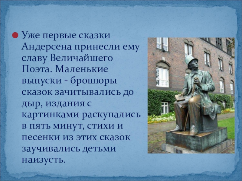 Слайд 13Уже первые сказки Андерсена принесли ему славу Величайшего Поэта. Маленькие выпуски