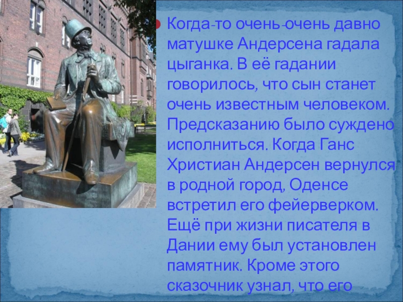 что сын станет очень известным человеком. Предсказанию было суждено исполниться. Когда Ганс Христиан Андерсен вернулся в родной город, Оденсе встретил его фейерверком. Ещё при жизни писателя в Дании ему был установлен памятник. Кроме этого сказочник узнал, что его сказки принадлежат к числу наиболее читаемых сказок во всём мире.