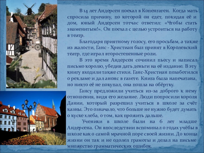 Слайд 12В 14 лет Андерсен поехал в Копенгаген. Когда мать спросила причину,