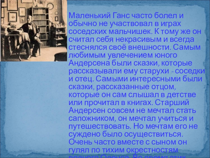 мальчишек. К тому же он считал себя некрасивым и всегда стеснялся своё внешности. Самым любимым увлечением юного Андерсена были сказки, которые рассказывали ему старухи - соседки и отец. Самыми интересными были сказки, рассказанные отцом, которые он сам слышал в детстве или прочитал в книгах. Старший Андерсен совсем не мечтал стать сапожником, он мечтал учиться и путешествовать. Но мечтам его не суждено было осуществиться. Очень часто вместе с сыном он гулял по тихим окрестностям родного Оденсе. Во время этих прогулок он и рассказывал мальчугану сказки.