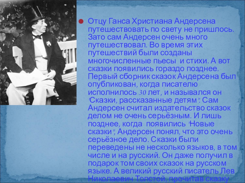 осуществить первое в жизни заграничное путешествие. В это же время Андерсен пишет большое количество литературных произведений, а в 1835 году — прославившие его «Сказки». Во второй половине 1840-х и в следующие годы Андерсен продолжал публиковать романы и пьесы, но эти произведения не имели успеха «Сказок».