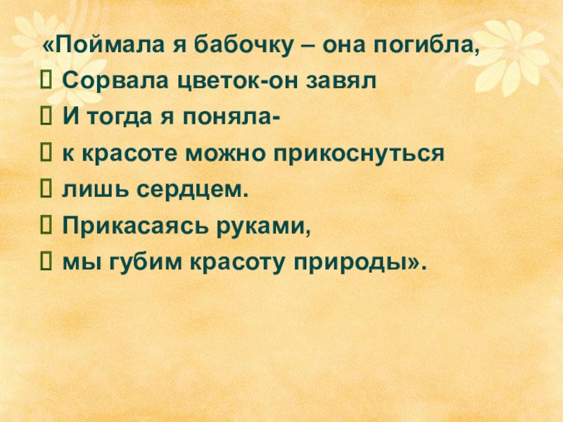«Поймала я бабочку – она погибла, Сорвала цветок-он завялИ тогда я поняла-к красоте можно прикоснуться лишь сердцем.