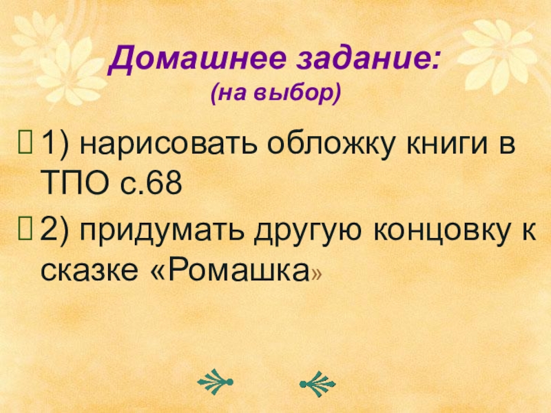 Домашнее задание: (на выбор)1) нарисовать обложку книги в ТПО с.682) придумать другую концовку к сказке «Ромашка»