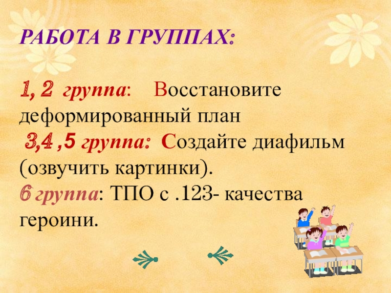 РАБОТА В ГРУППАХ:1, 2 группа:  Восстановите деформированный план 3,4 ,5 группа: Создайте диафильм(озвучить картинки).6 группа: ТПО