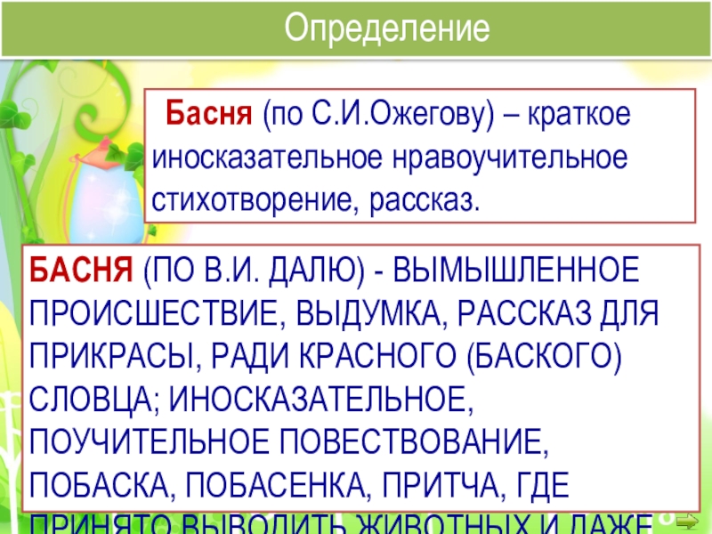 Басня (по С.И.Ожегову) – краткое иносказательное нравоучительное стихотворение, рассказ.