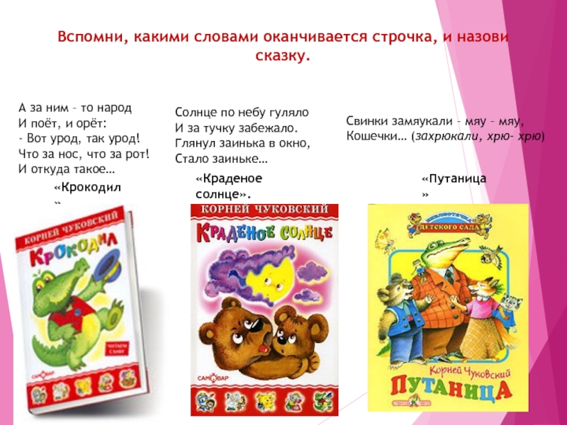 Вспомни, какими словами оканчивается строчка, и назови сказку.