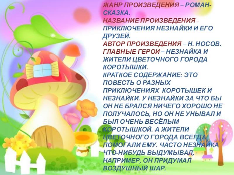 КРАТКОЕ СОДЕРЖАНИЕ: ЭТО ПОВЕСТЬ О РАЗНЫХ ПРИКЛЮЧЕНИЯХ КОРОТЫШЕК И НЕЗНАЙКИ. У НЕЗНАЙКИ ЗА ЧТО БЫ ОН НЕ БРАЛСЯ НИЧЕГО ХОРОШО НЕ ПОЛУЧАЛОСЬ, НО ОН НЕ УНЫВАЛ И БЫЛ ОЧЕНЬ ВЕСЁЛЫМ КОРОТЫШКОЙ. А ЖИТЕЛИ ЦВЕТОЧНОГО ГОРОДА ВСЕГДА ПОМОГАЛИ ЕМУ. ЧАСТО НЕЗНАЙКА ЧТО-НИБУДЬ ВЫДУМЫВАЛ, НАПРИМЕР, ОН ПРИДУМАЛ ВОЗДУШНЫЙ ШАР.
