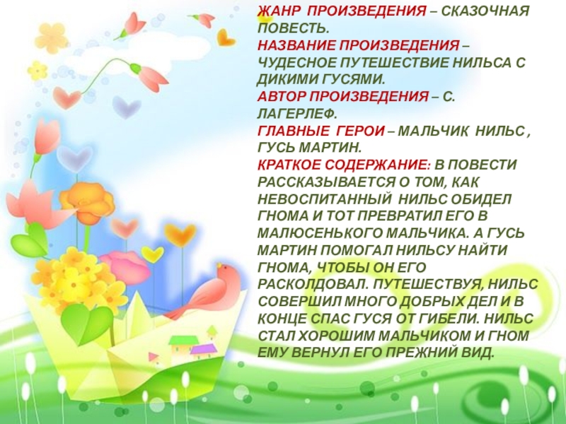 КРАТКОЕ СОДЕРЖАНИЕ: В ПОВЕСТИ РАССКАЗЫВАЕТСЯ О ТОМ, КАК НЕВОСПИТАННЫЙ НИЛЬС ОБИДЕЛ ГНОМА И ТОТ ПРЕВРАТИЛ ЕГО В МАЛЮСЕНЬКОГО МАЛЬЧИКА. А ГУСЬ МАРТИН ПОМОГАЛ НИЛЬСУ НАЙТИ ГНОМА, ЧТОБЫ ОН ЕГО РАСКОЛДОВАЛ. ПУТЕШЕСТВУЯ, НИЛЬС СОВЕРШИЛ МНОГО ДОБРЫХ ДЕЛ И В КОНЦЕ СПАС ГУСЯ ОТ ГИБЕЛИ. НИЛЬС СТАЛ ХОРОШИМ МАЛЬЧИКОМ И ГНОМ ЕМУ ВЕРНУЛ ЕГО ПРЕЖНИЙ ВИД.