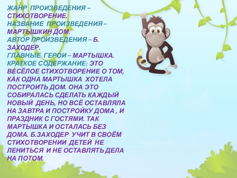 КРАТКОЕ СОДЕРЖАНИЕ: ЭТО ВЕСЁЛОЕ СТИХОТВОРЕНИЕ О ТОМ, КАК ОДНА МАРТЫШКА ХОТЕЛА ПОСТРОИТЬ ДОМ. ОНА ЭТО СОБИРАЛАСЬ СДЕЛАТЬ КАЖДЫЙ НОВЫЙ ДЕНЬ, НО ВСЁ ОСТАВЛЯЛА НА ЗАВТРА И ПОСТРОЙКУ ДОМА , И ПРАЗДНИК С ГОСТЯМИ. ТАК МАРТЫШКА И ОСТАЛАСЬ БЕЗ ДОМА. Б.ЗАХОДЕР УЧИТ В СВОЁМ СТИХОТВОРЕНИИ ДЕТЕЙ НЕ ЛЕНИТЬСЯ И НЕ ОСТАВЛЯТЬ ДЕЛА НА ПОТОМ.