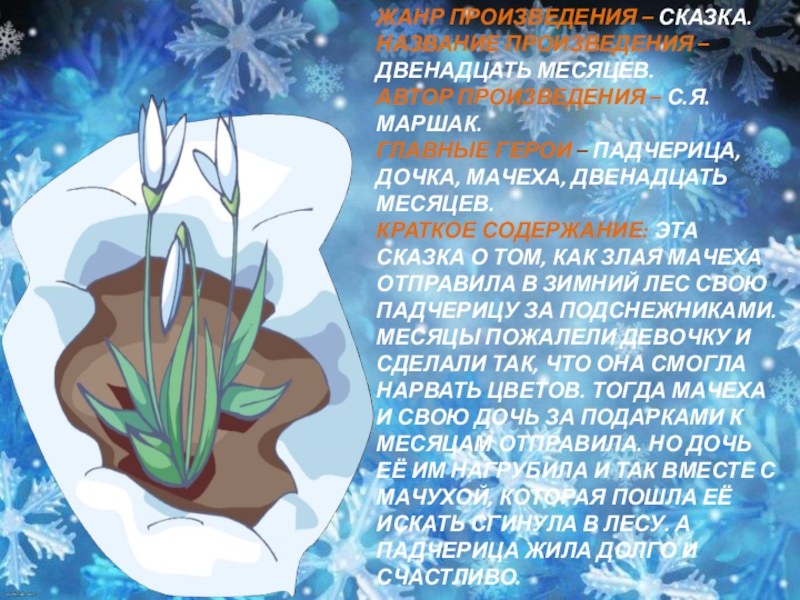 КРАТКОЕ СОДЕРЖАНИЕ: ЭТА СКАЗКА О ТОМ, КАК ЗЛАЯ МАЧЕХА ОТПРАВИЛА В ЗИМНИЙ ЛЕС СВОЮ ПАДЧЕРИЦУ ЗА ПОДСНЕЖНИКАМИ. МЕСЯЦЫ ПОЖАЛЕЛИ ДЕВОЧКУ И СДЕЛАЛИ ТАК, ЧТО ОНА СМОГЛА НАРВАТЬ ЦВЕТОВ. ТОГДА МАЧЕХА И СВОЮ ДОЧЬ ЗА ПОДАРКАМИ К МЕСЯЦАМ ОТПРАВИЛА. НО ДОЧЬ ЕЁ ИМ НАГРУБИЛА И ТАК ВМЕСТЕ С МАЧУХОЙ, КОТОРАЯ ПОШЛА ЕЁ ИСКАТЬ СГИНУЛА В ЛЕСУ. А ПАДЧЕРИЦА ЖИЛА ДОЛГО И СЧАСТЛИВО.