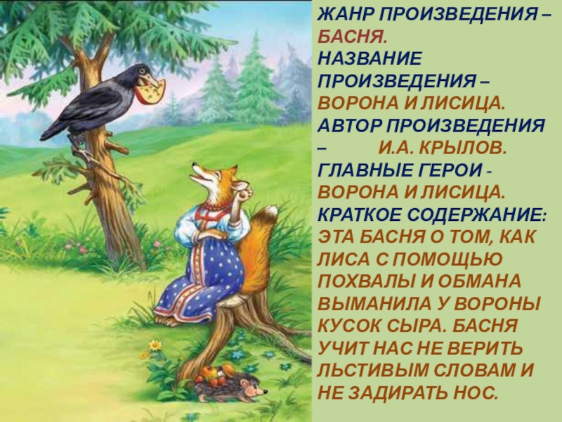 КРАТКОЕ СОДЕРЖАНИЕ: ЭТА БАСНЯ О ТОМ, КАК ЛИСА С ПОМОЩЬЮ ПОХВАЛЫ И ОБМАНА ВЫМАНИЛА У ВОРОНЫ КУСОК СЫРА. БАСНЯ УЧИТ НАС НЕ ВЕРИТЬ ЛЬСТИВЫМ СЛОВАМ И НЕ ЗАДИРАТЬ НОС.