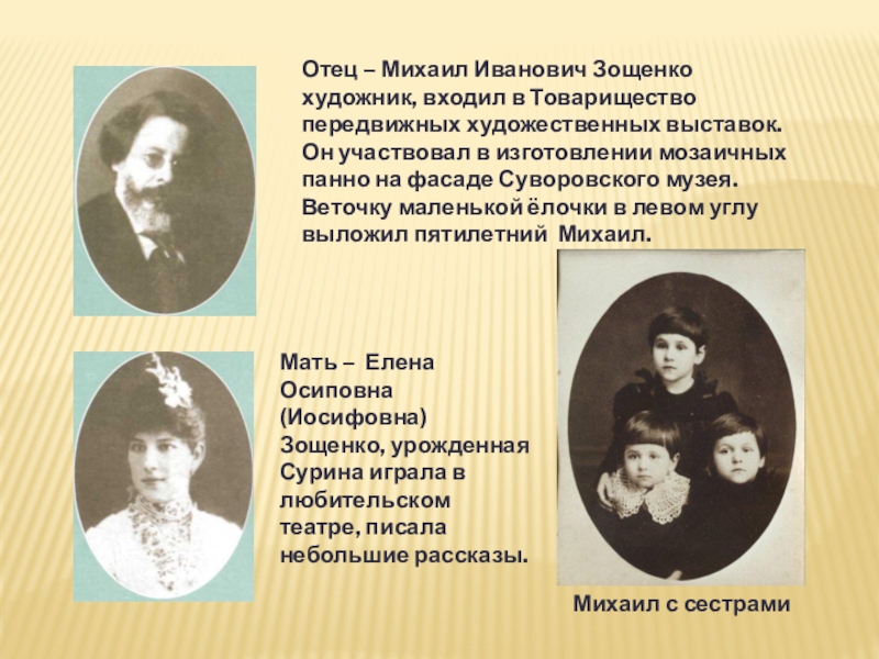 Мать – Елена Осиповна (Иосифовна) Зощенко, урожденная Сурина играла в любительском театре, писала небольшие рассказы.
