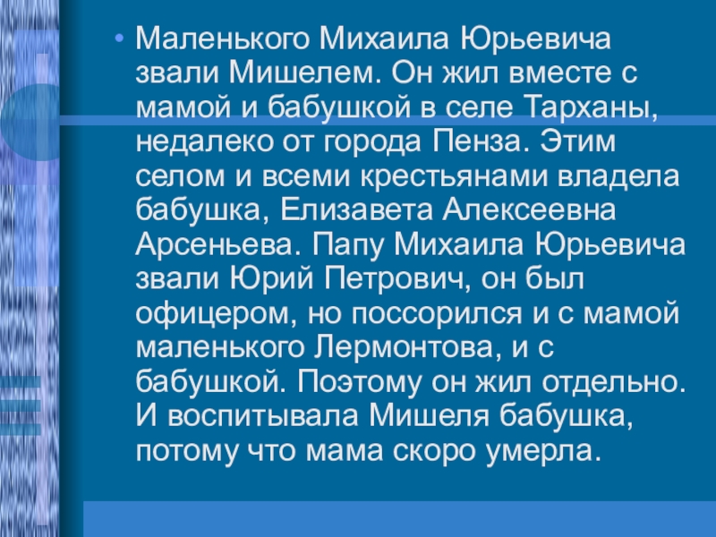 бабушкой в селе Тарханы, недалеко от города Пенза. Этим селом и всеми крестьянами владела бабушка, Елизавета Алексеевна Арсеньева. Папу Михаила Юрьевича звали Юрий Петрович, он был офицером, но поссорился и с мамой маленького Лермонтова, и с бабушкой. Поэтому он жил отдельно. И воспитывала Мишеля бабушка, потому что мама скоро умерла.