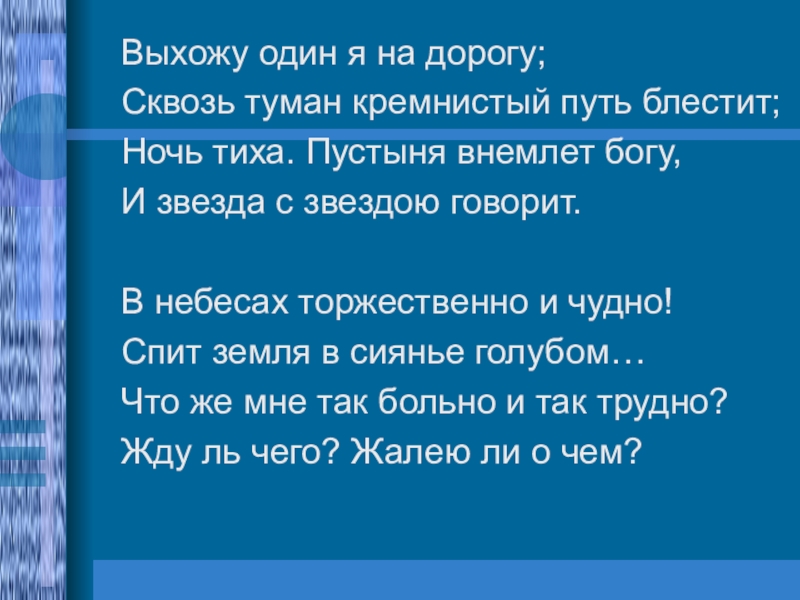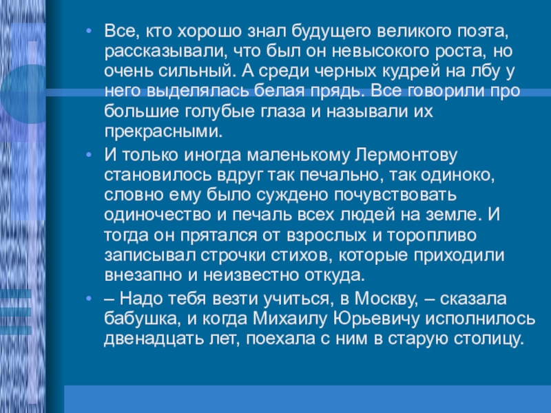И только иногда маленькому Лермонтову становилось вдруг так печально, так одиноко, словно ему было суждено почувствовать одиночество и печаль всех людей на земле. И тогда он прятался от взрослых и торопливо записывал строчки стихов, которые приходили внезапно и неизвестно откуда.