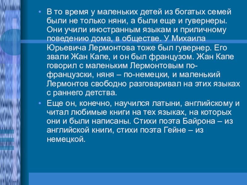 только няни, а были еще и гувернеры. Они учили иностранным языкам и приличному поведению дома, в обществе. У Михаила Юрьевича Лермонтова тоже был гувернер. Его звали Жан Капе, и он был французом. Жан Капе говорил с маленьким Лермонтовым по-французски, няня – по-немецки, и маленький Лермонтов свободно разговаривал на этих языках с раннего детства.