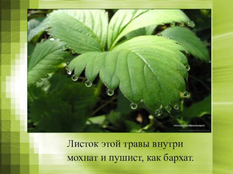 Слайд 15Листок этой травы внутри мохнат и пушист, как бархат.