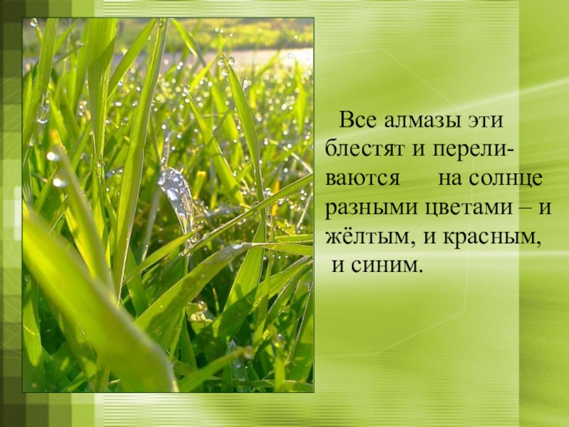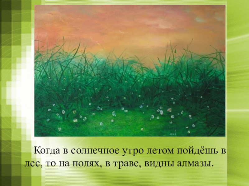 Когда в солнечное утро летом пойдёшь в лес, то на полях, в траве, видны алмазы.