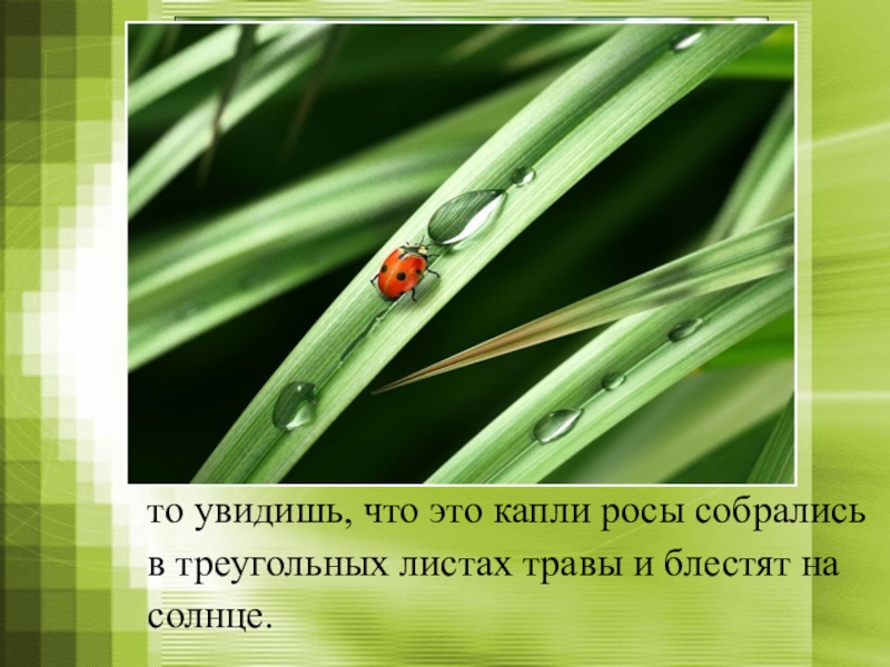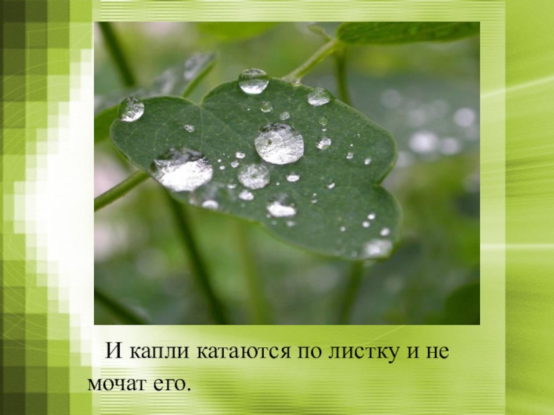 Слайд 17Когда неосторожно сорвёшь листок с росинкой, то капелька скатится,