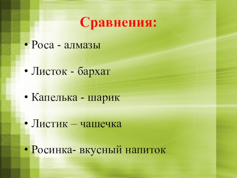 Сравнения: Роса - алмазы Листок - бархат Капелька - шарик Листик – чашечка Росинка- вкусный напиток