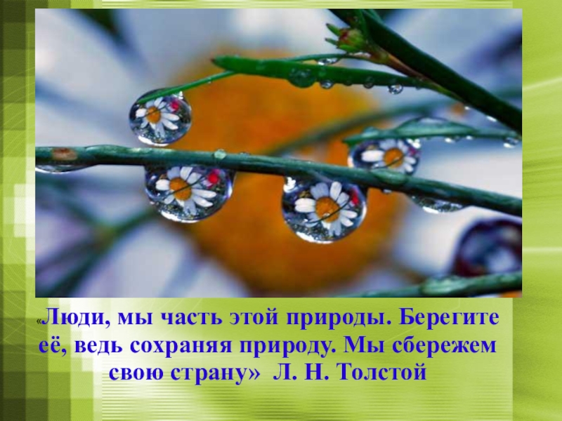 «Люди, мы часть этой природы. Берегите её, ведь сохраняя природу. Мы сбережем свою страну» Л. Н. Толстой