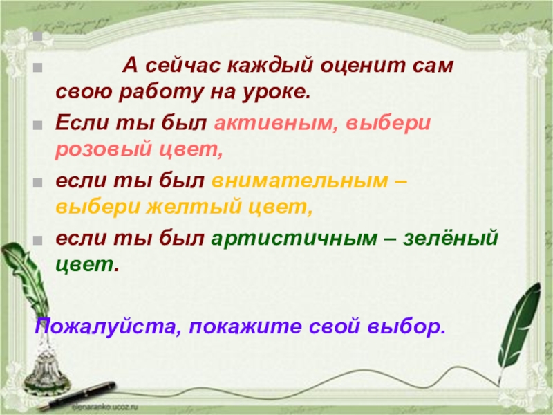 А сейчас каждый оценит сам свою работу на уроке.