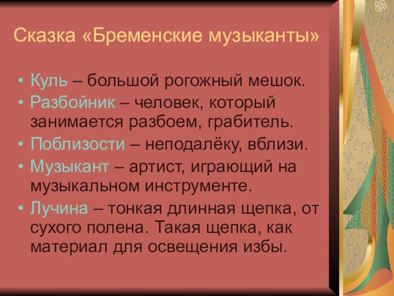 Сказка «Бременские музыканты»Куль – большой рогожный мешок.Разбойник – человек, который занимается разбоем, грабитель.Поблизости – неподалёку, вблизи.Музыкант –