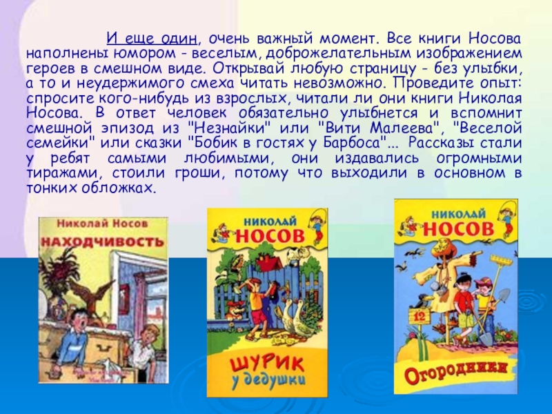 очень важный момент. Все книги Носова наполнены юмором - веселым, доброжелательным изображением героев в смешном виде. Открывай любую страницу - без улыбки, а то и неудержимого смеха читать невозможно. Проведите опыт: спросите кого-нибудь из взрослых, читали ли они книги Николая Носова. В ответ человек обязательно улыбнется и вспомнит смешной эпизод из "Незнайки" или "Вити Малеева", "Веселой семейки" или сказки "Бобик в гостях у Барбоса"... Рассказы стали у ребят самыми любимыми, они издавались огромными тиражами, стоили гроши, потому что выходили в основном в тонких обложках.