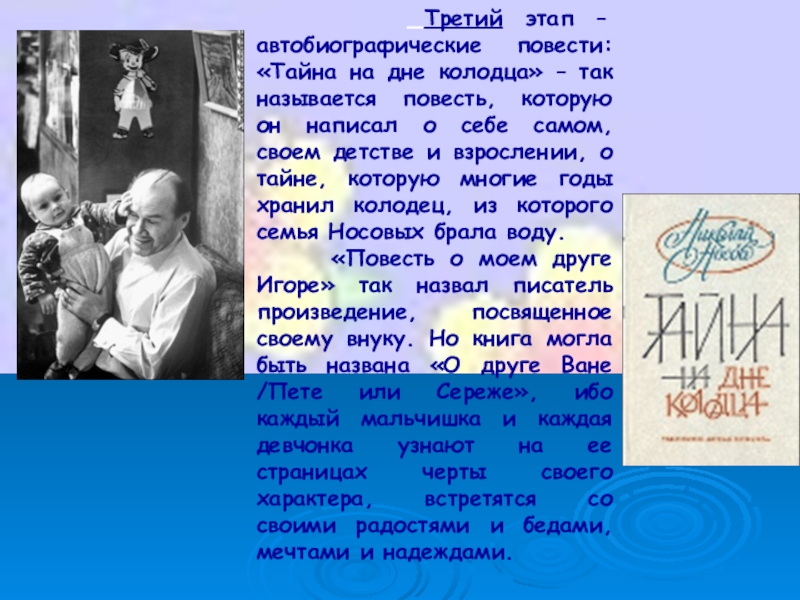 на дне колодца» – так называется повесть, которую он написал о себе самом, своем детстве и взрослении, о тайне, которую многие годы хранил колодец, из которого семья Носовых брала воду.