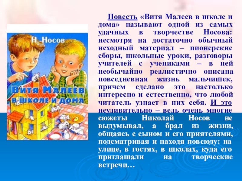 дома» называют одной из самых удачных в творчестве Носова: несмотря на достаточно обычный исходный материал – пионерские сборы, школьные уроки, разговоры учителей с учениками – в ней необычайно реалистично описана повседневная жизнь мальчишек, причем сделано это настолько интересно и естественно, что любой читатель узнает в них себя. И это неудивительно – ведь очень многие сюжеты Николай Носов не выдумывал, а брал из жизни, общаясь с сыном и его приятелями, подсматривая и находя повсюду: на улице, в гостях, в школах, куда его приглашали на творческие встречи…